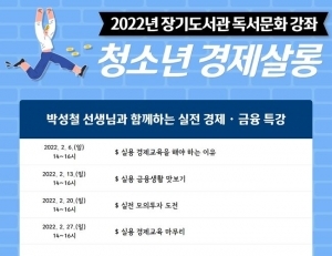 김포시 장기도서관은 2022년 2월 6일부터 2월 27일(매주 일요일) 오후 14시부터 16시까지 총 4회에 걸쳐 김포시 청소년을 대상으로 `청소년 경제 살롱` 강연을 운영한다. `청소년 경제 살롱` 강연은 청소년을 대상으로 실용 경제 교육과 금융 생활에 대한 기초 교육을 진행하는 시간으로 매주 일요일 줌을 이용한 비대면 수업으로 진행한다. 이번 ...