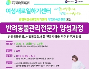 광명여성새로일하기센터는 15일부터 3월 12일까지 직업교육훈련 ‘반려동물관리전문가 양성과정’ 참여자 20명을 모집한다. 교육대상은 반려동물산업에 대한 이해도와 관심도가 높으며, 관련분야 취(창)업 의사가 확고한 여성으로 반려동물산업 분야 창업예비자, 전공자, 자격 취득자, 경력자는 우대한다. 교육기간은 3월 29일부터 6...