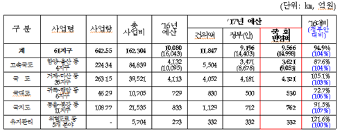 지난 3일, 국회 본회의에서 의결된 경남도의 2017년도 도로분야의 국고예산 반영액은 고속국도 2건 3,621억원, 국도 및 국대도 32건 4,851억원, 국가지원지방도 10건 762억원, 유지관리분야 332억원을 확보해, 정부예산안 대비 104% 증액 확보했다.