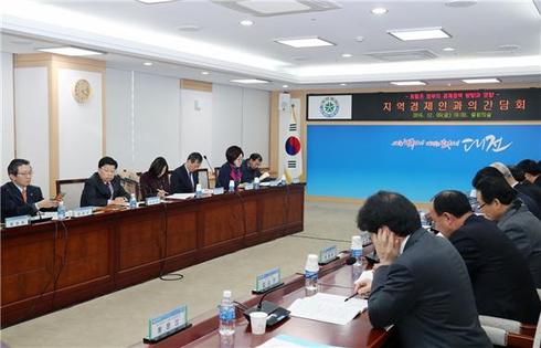 이날 간담회는 정성욱 대한건설협회 대전광역시회장, 김한수 한국은행 대전충남본부장, 안경남 한국무역협회 대전충남기업협의회장 등 지역 경제인 23명이 참석한 가운데 권선택 시장 주재로 진행되었다