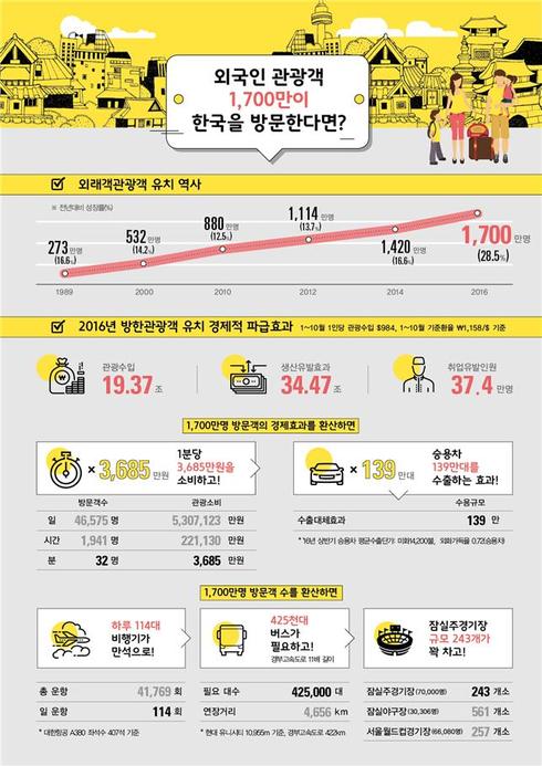 외래관광객 1,700만 명 입국은 19조 4천억 원의 관광수입과 34조 5천억 원의 생산유발효과를 가져오며, 취업유발인원은 37만 4천 명에 달하는 등 내수 활성화와 일자리 창출에 미치는 긍정적인 효과가 매우 크다. 한편, 외래관광객 1,700만 명을 시간으로 환산하면, 시간당 1,941명, 분당 32명의 외래관광객이 방한하고 있으며, 이는 하루 114대의 비행기가 만석으로 들어올 때 가능한 수치이다.