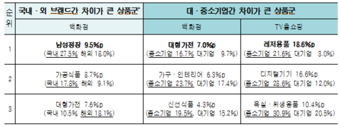 대·중소기업간 차이는 전반적으로 백화점보다 TV홈쇼핑에서 더 크게 나타났으며 특히, 레저용품(18.6%p), 디지털기기(16.6%p)는 15%p를 초과했으며, 백화점 분야에서는 대형가전(7.0%p) 외에 가구·인테리어(6.3%p), 신선식품(4.3%p) 등이 대·중소기업간 차이가 큰 품목으로 나타났다.