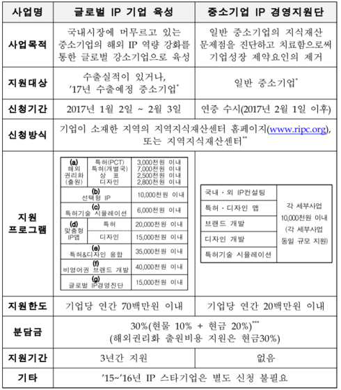 2017년 『지식재산 창출지원』사업은 전국의 성장잠재력 있는 중소기업을 대상으로 하는 지식재산 지원 사업으로써, “글로벌 IP 기업육성” 및 “중소기업 IP 경영지원단”의 2가지 세부사업으로 구성된다.