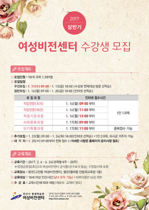 안산시 여성비전센터, 2017 상반기 수강생 모집