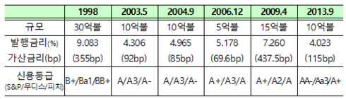 금번 외평채는 국가신용등급이 AA로의 상향조정된 이후 처음으로 발행되는 달러화 표시 채권으로서, 만기 10년, 10억불 규모, 美 국채(10년물) 금리 대비 55bp의 가산금리로 발행되었다.