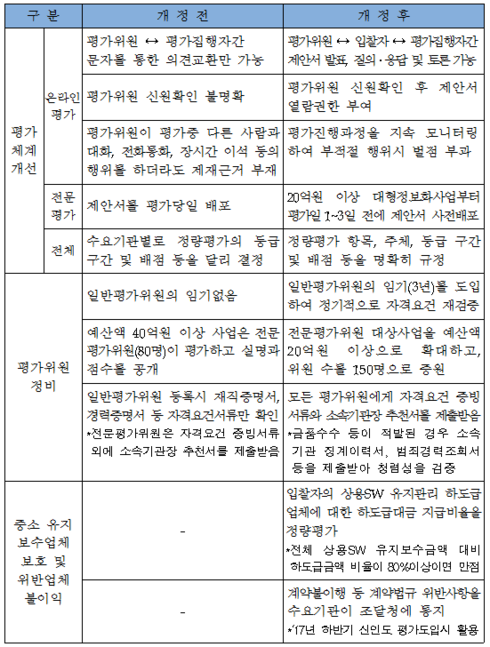 이번 조치는 그간 제도운영과정에서 지속적으로 보완이 요구된 온라인 평가체계, 평가위원 자격요건, SW 제값주기 등을 개선하기 위한 것으로 주요 개정내용은 다음과 같다.