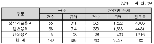 또한 일반용역은 10억 원 이상 8건을 제외한 78건이 중소기업간 경쟁 입찰 또는 10억 원 미만 사업으로서 전체금액의 50.3%인 158억 원 상당을 중소기업이 수주할 것으로 전망된다.