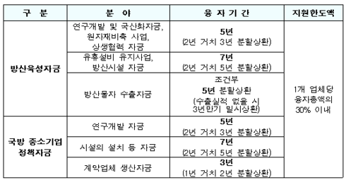 특히, 올해부터는 융자지원 범위 내에서 업체의 자체적인 자금 조정이 가능토록 집행에 융통성을 부여하고, 국방 중소기업 정책자금의 지원 요건을 완화하여 진입문턱을 낮추는 한편, 투자비용이 많이 소요되고, 자금 회수 기간이 긴 연구개발·시설자금의 대출기간을 최장 7년까지 연장하여 중소기업의 상환 부담을 완화할 예정이다.