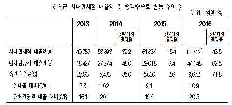 다만, 2016년 송객수수료 증가율(71.8%)이 시내면세점 매출액과 단체관광객 매출액 증가율을 상회한 것으로 나타났는데, 이는 단체관광객 유치를 위한 면세점간 경쟁 심화에 기인한 것으로 보이며 송객수수료율은 최근 3년간 20% 수준을 유지하고 있는 것으로 나타났다.