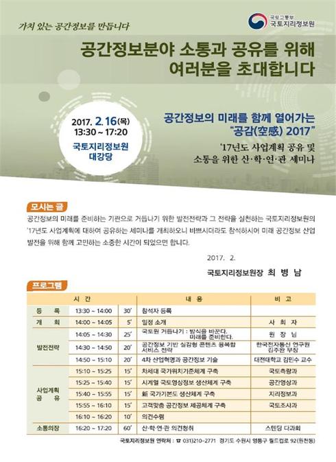 [시사인경제]책임운영기관인 국토지리정보원은 오는 16일에 4차 산업혁명 등에 대응할 수 있도록 공간정보의 미래를 준비하기 위한 발전전략과 올해 사업계획을 마련하여 공간정보 분야 산·학·연·관이 한자리에 모여 공유하고 발전적인 의견을 듣기 위한 ‘공감(空感) 2017’ 세미나를 개최한다고 밝혔다.