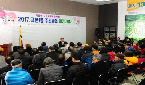 [시사인경제]구리시는 백경현 구리시장이 지난 16일부터 각 부서장들과 함께 동 주민세터를 순회하며 진행하고 있는‘주민들과의 대화, 희망이야기’가 지역 현안에 대한 주민들의 관심이 연일 호응을 얻고 있는 가운데 지난 17일에는 주택밀집 지역인 교문1동에서 격의 없는 소통의 시간을 가졌다고 밝혔다.