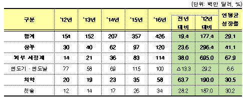 지난해 주요 목욕용품 수출액은 4억 3천만 달러로 2012년 1억 5천만 달러 대비 177.4% 증가하였으며, 지난해 수입액 3억 5천만 달러와 비교하면 수출액이 수입액의 1.2배에 이르는 것으로 나타났다.
