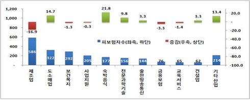 피보험자 증가율은 숙박음식(10.7%), 예술, 스포츠 및 여가 관련 서비스(6.7%), 연구개발, 법무, 기술, 엔지니어링 등을 포함하는 전문과학기술서비스(5.8%) 산업 순으로 높은 것으로 나타났다.