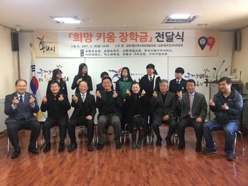 [시사인경제]구리시 교문1동은 지난 10일 지역사회보장협의체와 주민자치위원회의 주관으로 관내 중・고・대학교 신입생 11명에게 장학금 500만원을 전달하는『희망키움 장학금』전달식을 가졌다고 밝혔다.