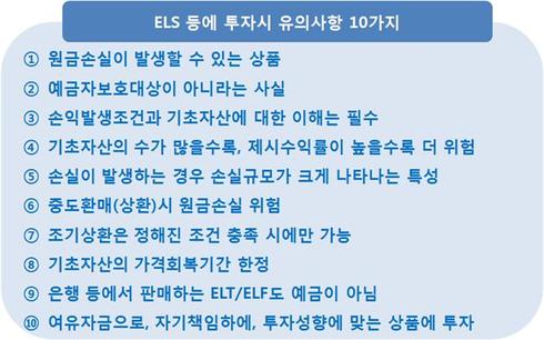 금감원은 ELS·DLS 등의 투자기간 동안 기초자산인 주가지수, 원유 가격 등에 다양한 요인이 부정적인 영향을 미칠 수 있고, 그런 요인들은 현재 시점에서 예측하기 어려울 수 있다는 점과 원금손실이 가능한 금융투자상품 이라는 점을 염두에 두고 자기책임으로 투자를 결정할 필요가 있다고 전했다.