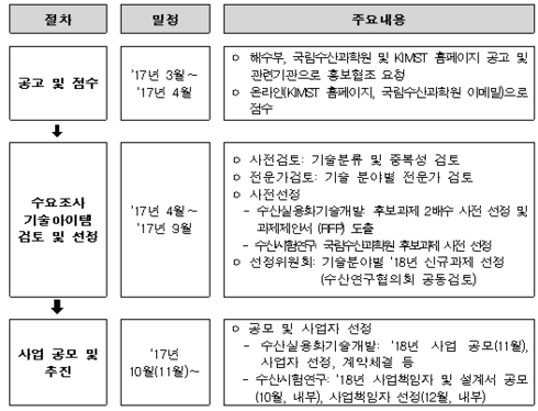제출된 기술수요조사서를 바탕으로 분야별 전문가들이 연구의 실효성 및 중복성 등을 검토하여 과제를 최종 선정하고, 과제가 선정되면 2018년 수산연구개발사업에 반영하여 기술개발에 착수할 계획이다. 기초·응용 단계에 있는 기술 연구는 국립수산과학원에서 수행하고, 실증·산업화 단계의 기술은 해양수산부에서 직접 지원하여 전 과정을 효율적으로 지원하는 ‘연구성과 이어달리기’가 이루어지도록 할 계획이다.