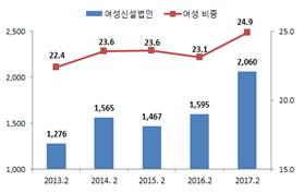금년 1월의 경우 신설법인수가 소폭 감소(Δ1.8%) 했으나, 2017년 1∼2월 기간을 합산하면 전년동기대비 7.9% 증가(1,192개) 하여, 지난해에 이어 금년에도 신설법인 증가세가 지속될 것으로 전망된다.