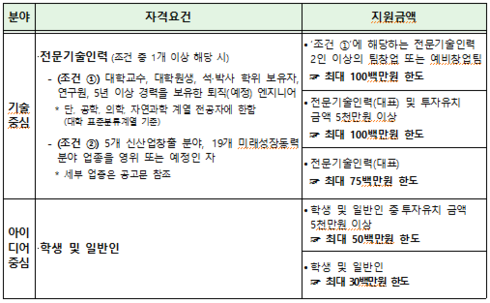 창업팀 구성과 투자유치 요건 등을 충족한 전문기술과제에 대해, 최대 1년간, 1억원 한도까지 사업화자금을 확대지원하여, 교수, 석·박사, 연구원 등 고급기술인력의 창업을 유도한다.