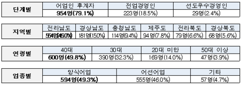 올해 수산업경영인 선정 현황 및 특징을 살펴보면, 어업인후계자가 954명(79.1%)으로 대다수를 차지하였으며 지역별로는 전라남도에서 554명(46.0%)으로 가장 많은 인원이 선정되었다. 또한, 연령별로는 40대가 600명(49.8%)으로 가장 많았고 30대가 390명(32.3%)으로 그 뒤를 이었으며, 업종별로는 양식어업 종사자가 594명(49.3%), 어선어업 종사자가 555명 (46.0%) 등 순으로 예년과 비슷한 수준을 보였다.