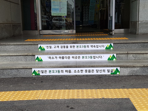 [시사인경제] 안산시 본오3동은 전 직원이 친절행정 실천으로 시민의 만족도와 신뢰도를 높이기 위해 청사 앞 계단에 친절 실천 표어 3개항을 부착했다.