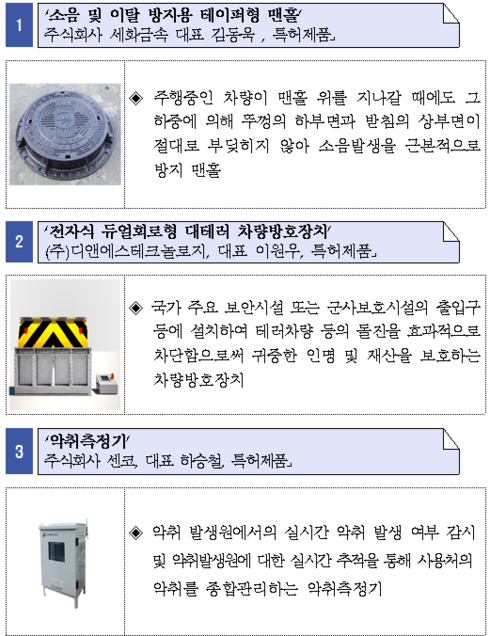 특색 있는 제품으로는, 주행중인 차량이 맨홀 위를 지나갈 때에도 그 하중에 의해 뚜껑의 하부면과 받침의 상부면이 절대로 부딪히지 않아 소음발생을 근본적으로 방지하는 ‘소음 및 이탈 방지용 테이퍼형 맨홀’, 국가 주요 보안시설 또는 군사보호시설의 출입구 등에 설치하여 테러차량 등의 돌진을 효과적으로 차단함으로써 귀중한 인명 및 재산을 보호하는 ‘전자식 듀얼회로형 대테러 차량방호장치’, 악취 발생원에서의 실시간 악취 발생 여부 감시 및 악취발생원에 대한 실시간 추적을 통해 사용처의 악취를 종합관리하는 ‘악취측정기’ 등이 있다.
