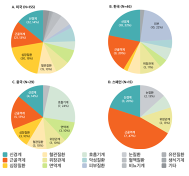 임상연구를 대상 질환별로 분석하면 신경계(49건), 근골격계(48건) 심장(42건), 혈관(31건), 위장관계(27건), 면역계(21건), 폐(19건) 등의 순으로 많았다.