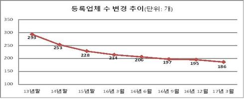 새롭게 등록된 업체는 없어, 2017년 3월 말 기준 등록 업체는 186개이다. 이는 업계 전반적인 성장 정체와 업종 내 수익성 악화에 기인한 것으로 보인다.