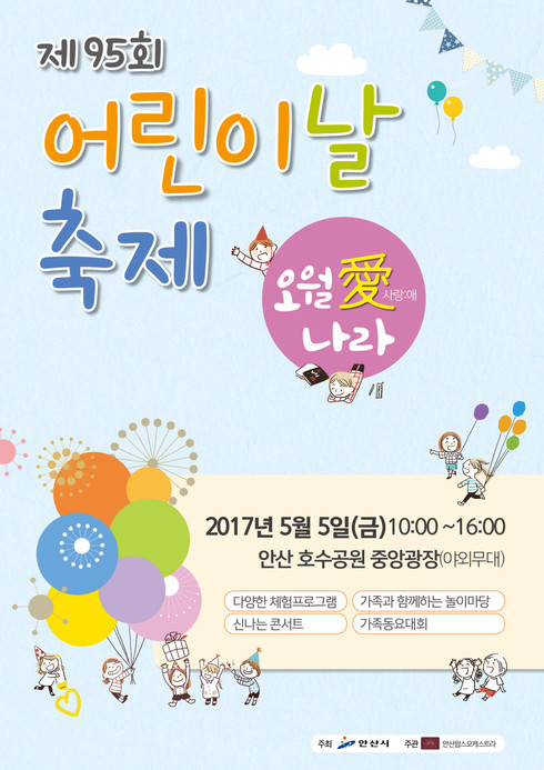 이번 어린이날 축제는 안산시가 주최하고 안산팝스오케스트라가 주관하며, 어린이 및 시민이 직접 참여하고 즐길 수 있는 참여공연을 비롯해 체험마당(소방수 방사체험 등 26개 부스체험), 공연마당(난타, 버블쇼, 조선마술사, 택견퍼포먼스)으로 진행될 예정이다.