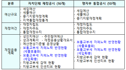 행정자치부는 ‘10년부터 각 지방자치단체 결산 재정공시 내용을 종합하여 인구와 재정여건 등이 비슷한 다른 지방자치단체와 비교 가능한 형태로 제공하는 통합공시 제도를 운영하고 있다.