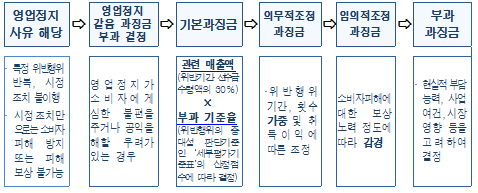 관련 매출액 산정이 가능할 경우, 영업 정지 기간(15일, 1개월, 3개월)과 중대성 정도에 따라 부과 기준율을 최소 1%에서 최대 30%로 정했다. 매출액 산정이 불가능할 경우, 기준 금액은 최소 500만 원에서 최대 5,000만 원으로 정해진다.