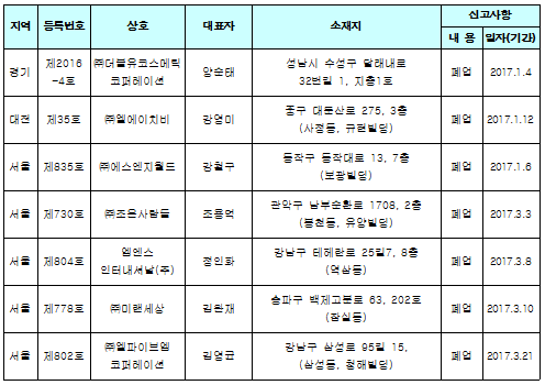 ㈜더블유코스메틱코퍼레이션, ㈜엘에이치비, ㈜에스엔지월드, ㈜조은사람들, 엠엔스인터내셔날㈜, 미랜세상(주), ㈜엘파이브엠코퍼레이션 등 7곳이 폐업했다.