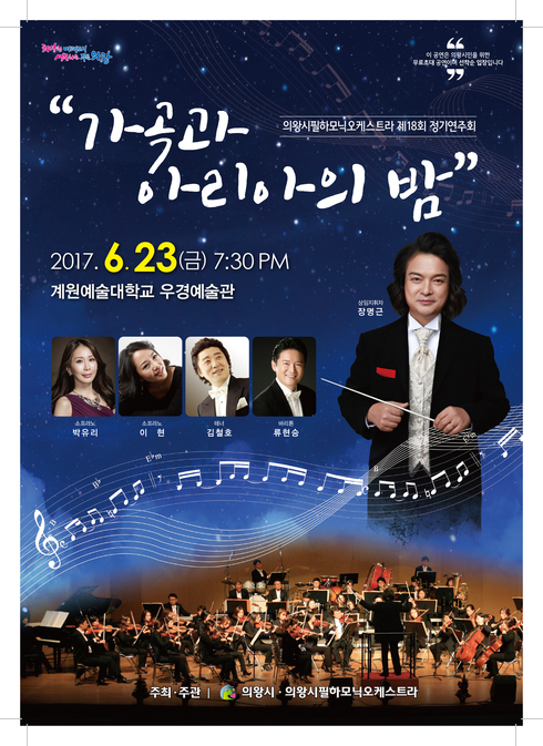장명근 지휘자가 이끄는 의왕시필하모닉오케스트라의 열 여덟 번째 정기연주회인 이번 행사는‘가곡과 아리아의 밤’이라는 주제로 주말 저녁을 맞아 아름다운 음악을 감상할 수 있는 좋은 기회가 될 것으로 보인다.
