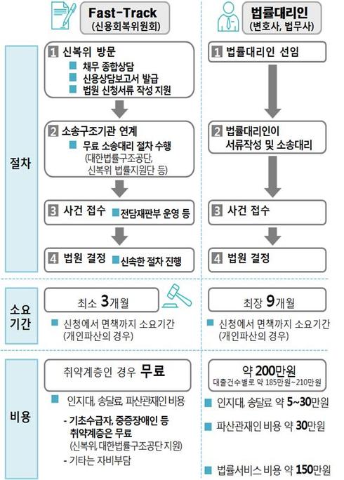 채무를 정상적으로 상환할 수 없는 채무자가 신용회복위원회와 지방법원이 지원하는 Fast-track을 이용하게 되면, 법원 개인 회생·파산을 진행하는데 소요되는 기간을 단축 할 수 있고, 법원 개인 회생·파산 절차를 진행하기 위해 필요한 비용을 절감하게 되며, 신용회복위원회의 신용상담보고서와 행정정보공동이용시스템을 통한 서류열람 등으로 법원 신청서류 작성·제출 부담이 경감된다.