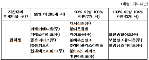 자산 대비 부채 비율 90% 미만 구간에 5개 사, 90% 이상 100% 미만 구간에 7개 사, 100% 이상 104% 미만 구간에 3개 사가 속한 것으로 나타났다.