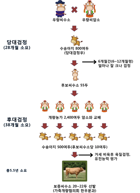 한우 보증씨수소 선발은 농촌진흥청 국립축산과학원이 국가단위 한우 유전능력평가를 종합적으로 실시해, 국가 가축개량협의회(한우분과)의 엄격한 심의와 평가를 거쳐 최종적으로 한우보증씨수소로 선발하게 된다. 앞서 한우검정 과정을 살펴보면, 당대검정과 후대검정으로 나누어 추진되는데, 당대검정(28개월)과 후대검정(36개월)을 거처 최종선발까지는 약 5.5년(약 66개월)이 걸린다고 정대진 담당연구사는 설명했다.