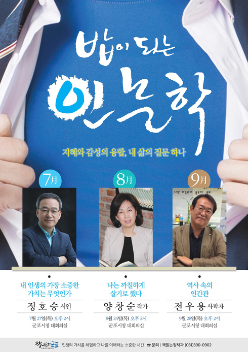 군포시는 ‘밥이 되는 인문학’ 7∼9월 강연의 강사로 정호승 시인, 양창순 작가, 전우용 사학자를 초빙했다고 12일 밝혔다.