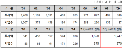 2016년 개인투자는 3,984명, 1,747억 원(소득공제 기준)으로 벤처버블이 꺼지면서 투자가 급감한 2004년 이후 투자자수와 투자규모에서 모두 최고치를 기록했다.