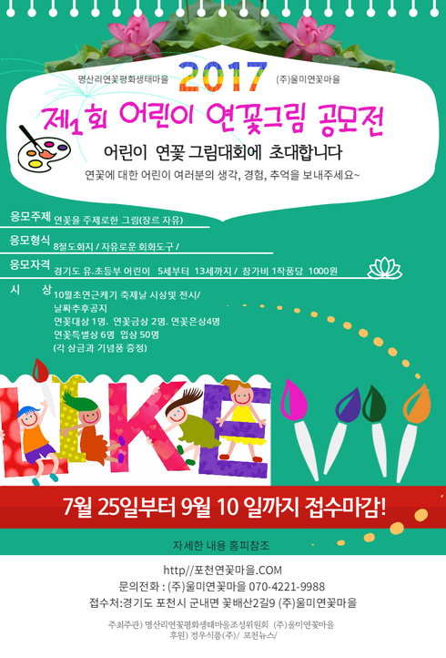 참가비는 1개 작품당 1,000원이며, 대상(50만원 장학금)을 비롯한 금상, 은상, 특별상, 입선 등 푸짐한 장학금과 상품이 준비돼 있으며, 자세한 사항은 홈페이지(http://포천연꽃마을.com)를 이용하거나 연꽃마을(070-4221-9988)을 통해 문의가 가능하다.