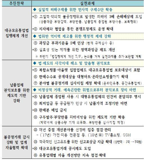 이를 개선하기 위해 ①대규모유통업법 집행체계 개선, ②납품업체 권익보호를 위한 제도적 기반 강화, ③불공정거래 감시 강화 및 업계 자율협력 확대 등 3대 전략, 15개 실천과제를 추진할 것이다.