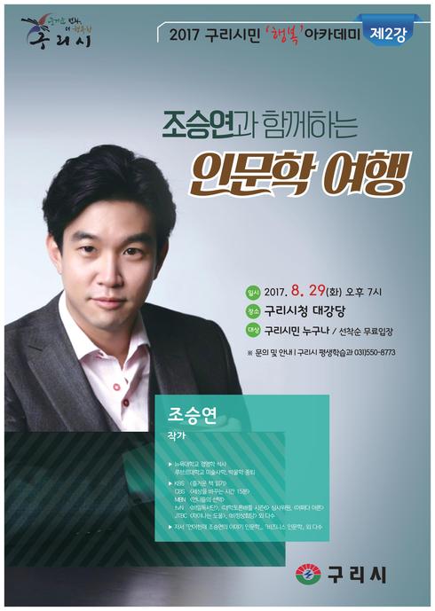 [시사인경제] 구리시는 오는 29일 오후 7시부터 시청 대강당에서 ‘2017년 구리시민 행복아카데미 제2강’을 통해 조승연 인문학 여행을 진행한다.