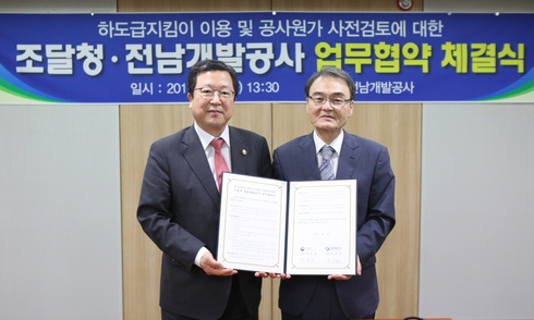 [시사인경제]조달청은 5일 전라남도 무안군 소재 전남개발공사에서 전남개발공사(사장 양지문)와 하도급지킴이 이용 및 공사원가 사전검토에 관한 업무협약(MOU)을 체결했다.