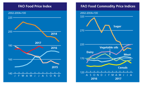 식량가격지수는 2017년 5월부터 7월까지 이후 3개월 연속 상승하다가 하락했으며, 곡물, 설탕 및 육류의 하락률이 커서 유지류, 유제품의 상승률을 상쇄한 것에 기인했다.
