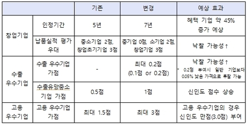 금번 개정은 국정 과제인 “중소기업의 튼튼한 성장 환경 구축” 중 세부 과제(창업기업 및 창의혁신제품 판로지원 강화)의 이행을 위해 추진된 사항으로, 이를 반영하기 위해 창업기업에 대한 우대사항이 신설 및 강화됐으며, 수출 및 고용 촉진을 위해 수출 및 고용 우수기업에 대한 우대도 강화됐다.