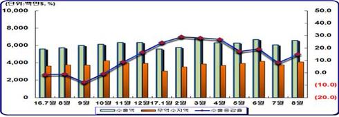 반면, 중국 사드여파 영향으로 4월(18억 6800만 달러)부터 전년 동월 대비 2.3% 수출 감소세를 보였으며, 8월(18억 6200만 달러)수출도 전년 동월대비 10.3% 감소한 것으로 분석됐다.