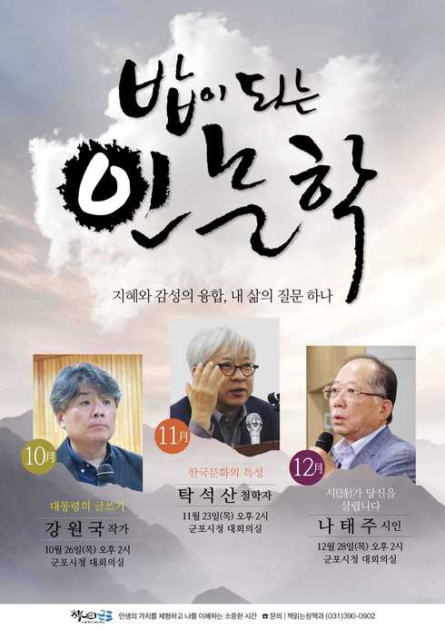 매년 시민들의 감성과 지성을 충족시켜 주고 있는 군포시 명사 초청 강연인 ‘밥이 되는 인문학’ 4분기 강사로 강원국 작가, 탁석산 철학자, 나태주 시인을 초빙한 것이다.