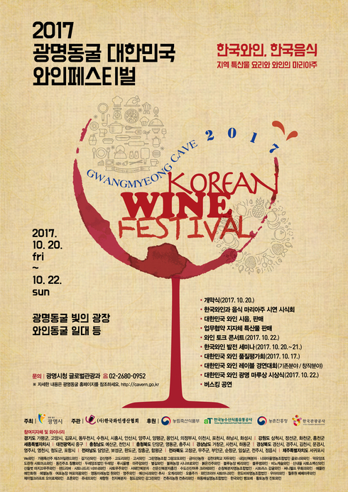 광명시는 대한민국 최고의 동굴테마파크인 광명동굴에서 한국와인과 지역 특산물을 사용한 한국음식의 절묘한 어울림을 맛볼 수 있는 ‘2017 광명동굴 대한민국 와인 페스티벌’을 20일부터 사흘간 개최한다고 16일 밝혔다.