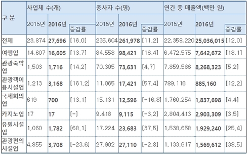2016년 관광사업체의 연간 총매출액은 25조 360억 원이며 전년 대비 12.0% 증가한 것으로 조사됐다. 업종별로 보면 ▲ 관광숙박업의 매출액이 8조 2,683억 원으로 가장 많았고, 다음으로 ▲ 여행업은 7조 6,427억 원, ▲ 카지노업은 2조 9,033억 원, ▲ 국제회의업은 1조 8,377억 원, ▲ 유원시설업은 1조 9,292억 원, ▲ 관광편의시설업은 1조 5,696억 원, ▲ 관광객이용시설업은 8,852억 원인 것으로 나타났다. 2015년과 비교해보면 모든 업종에서 매출액이 증가했으며 특히 관광면세업이 추가된 관광편의시설업(38.5% 증가)과 사업체 수가 증가한 유원시설업(25.4% 증가)의 매출액이 크게 증가했다.