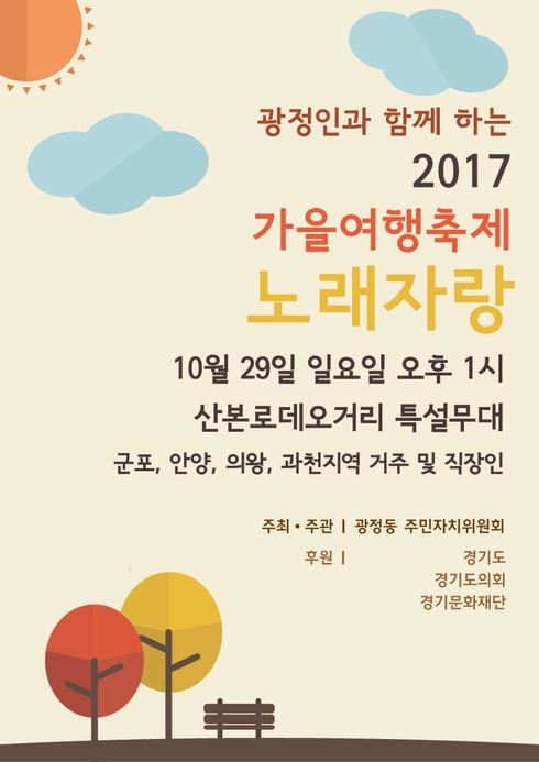[시사인경제] 군포시 광정동은 주민자치위원회 주관으로 오는 29일 ‘광정인과 함께하는 2017 가을여행 축제(노래자랑)’를 개최한다.