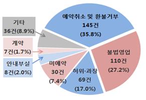 민원 유형별로는 예약 취소 및 환불 거부에 관한 민원이 145건(35.8%)으로 가장 많았고 불법 숙박업체 신고 110건(27.2%), 허위·과장 정보 제공 69건(17.0%)이 그 뒤를 이었다.