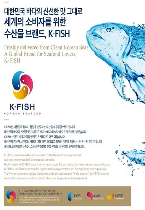 ‘케이 피시(K·FISH)’는 우리 수산물의 고급화 및 세계적인 경쟁력 확보를 위해 만든 수산물 수출 통합 브랜드로서 엄격한 관리규정과 체계화된 품질평가기준을 통과한 수산물에 한해서만 사용이 허용된다.